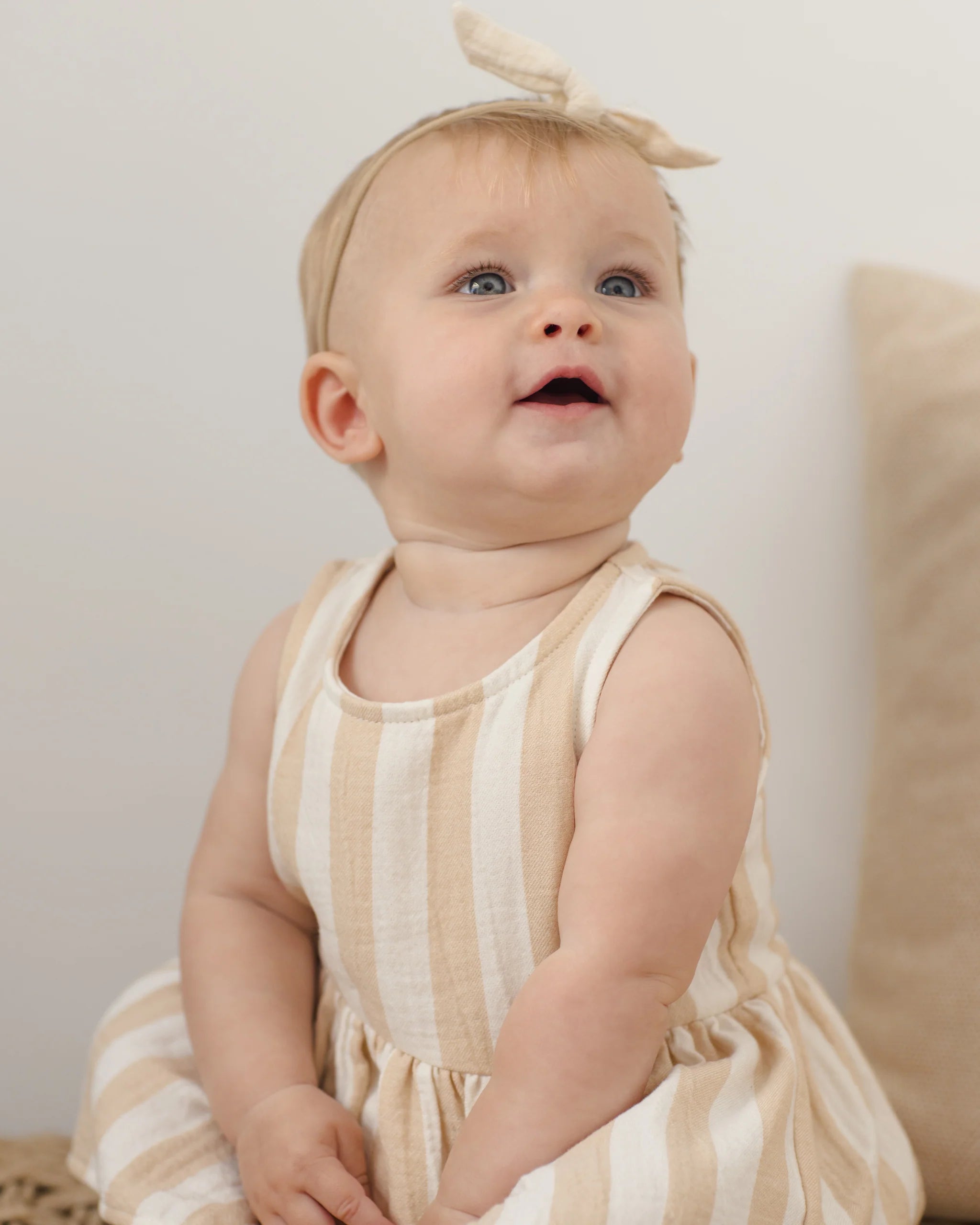Skirted tank one-piece in this organic cotton gauze fabric, with a button back closure and snaps at the bottom for easy changes.