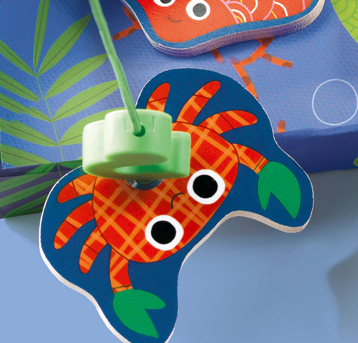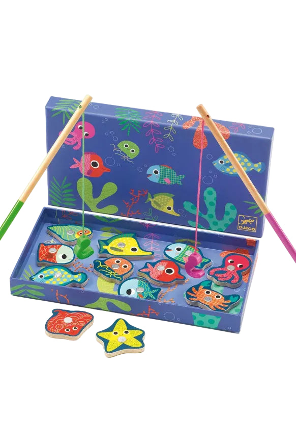 - Contents: 12 pieces (wood and metal), 2 fishing rods (wood, plastic, magnet), and 1 decorative box