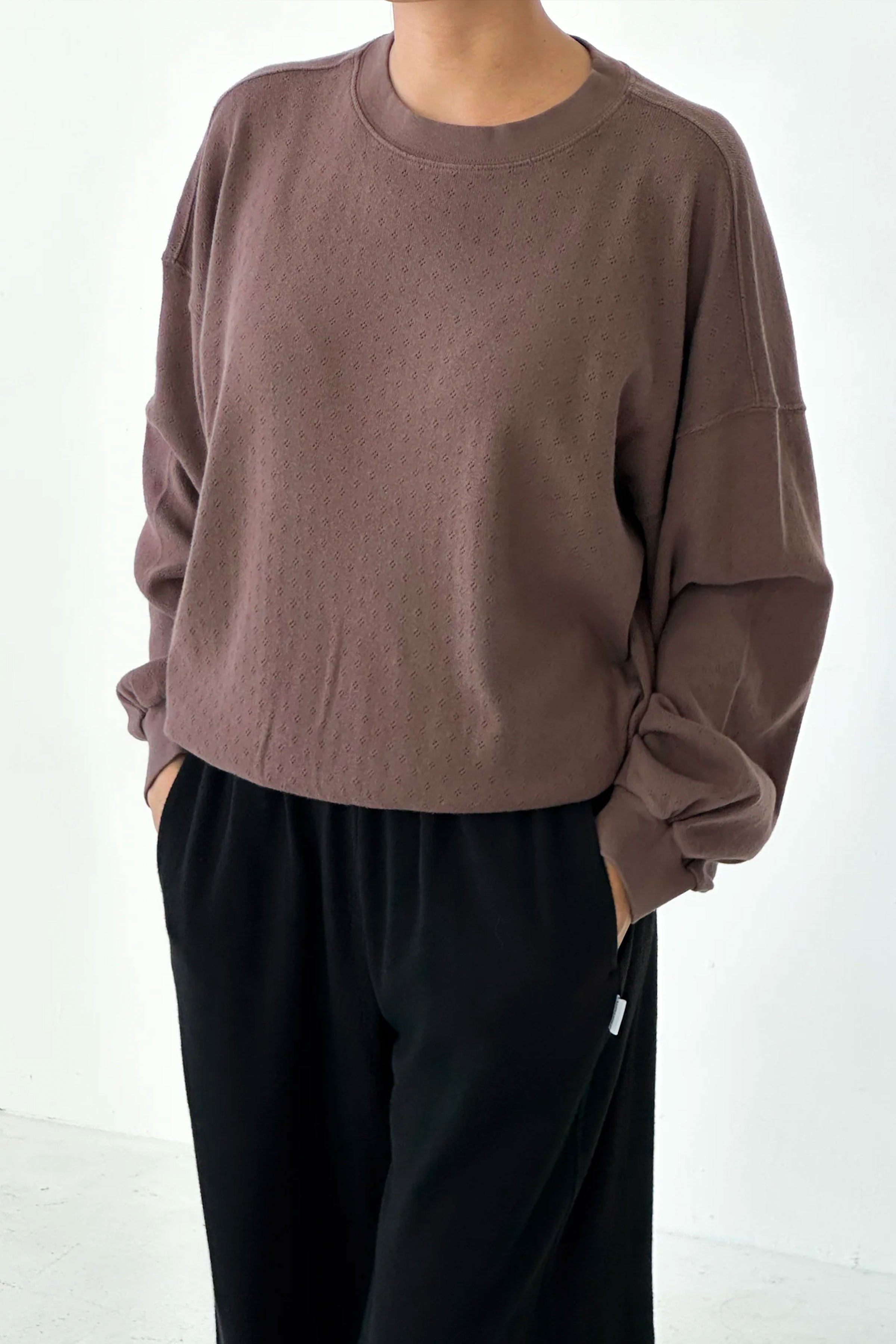 A lightweight layer for shifting seasons. The Pointelle Core Sweatshirt is made from ultra-soft jersey pointelle, offering just the right mix of breathability and warmth. With its relaxed drape and voluminous sleeves, it’s a refined take on cozy.