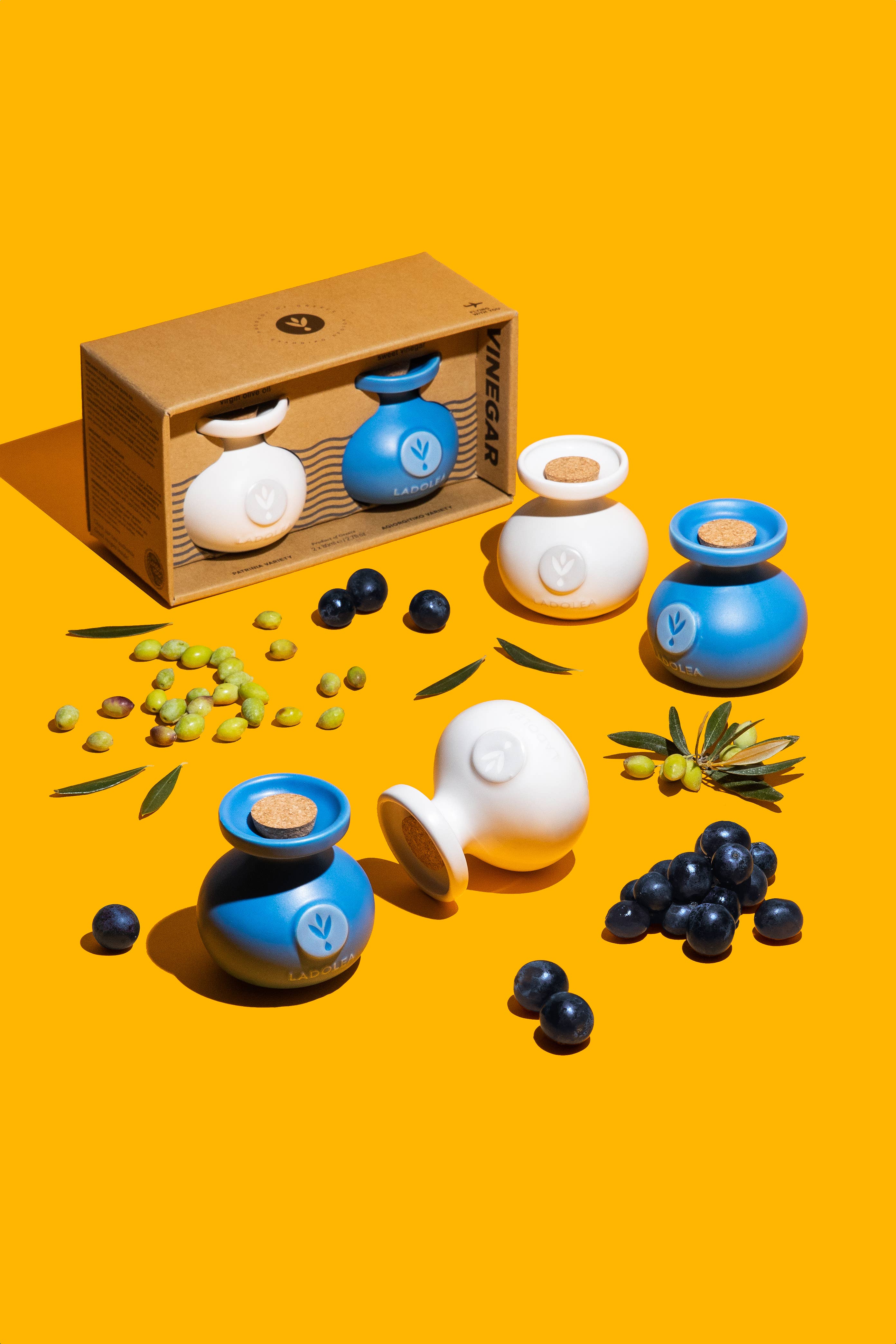 A gift set made up of 2 ceramic bottles of 80mL each. One bottles includes a Greek organic extra virgin olive oil and an organic sweet vinegar.