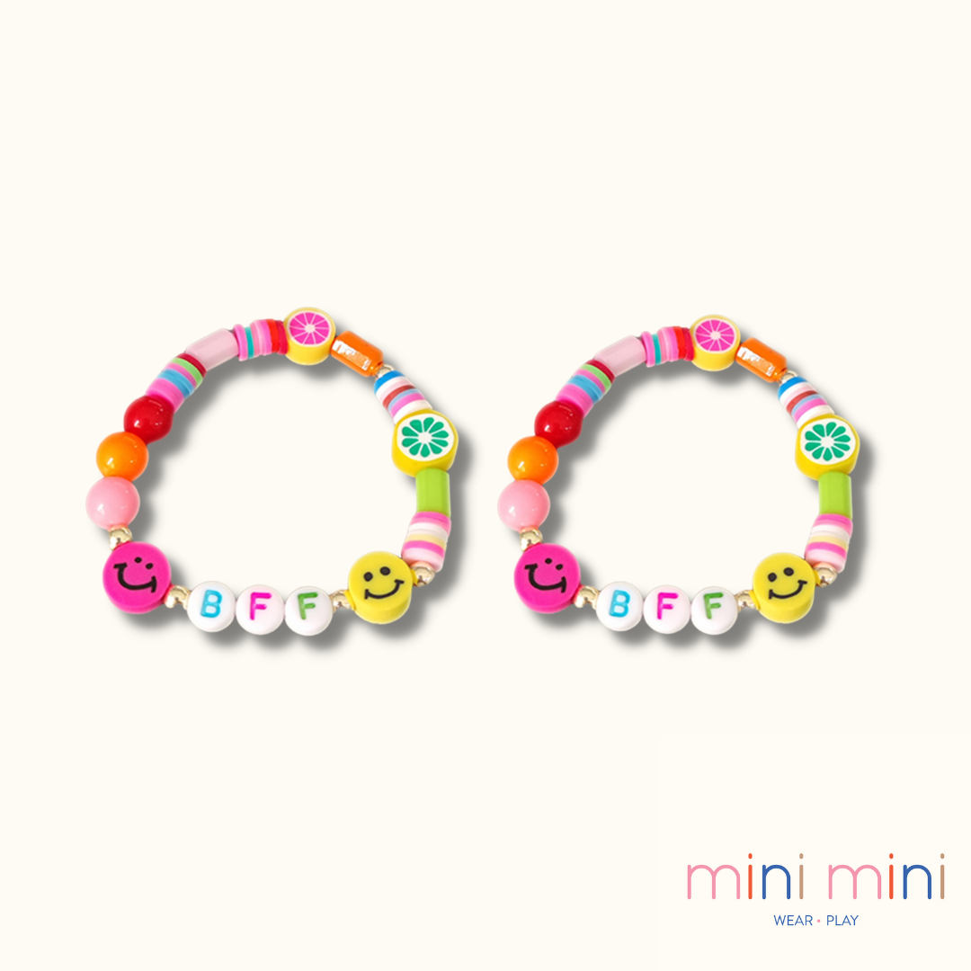 Cute and Stretchy Friendship Charm Bracelet- set of 2. Perfect to stack or wear on its own. Whether it’s a special occasion, gift this BFF Kids Charm Bracelet set from mini mini to your besties to showcase what they mean to you. Kids sizes Designed with: happy faces, cute fruits and colorful beads. easy to take on and off. Recommended for kids ages 3+