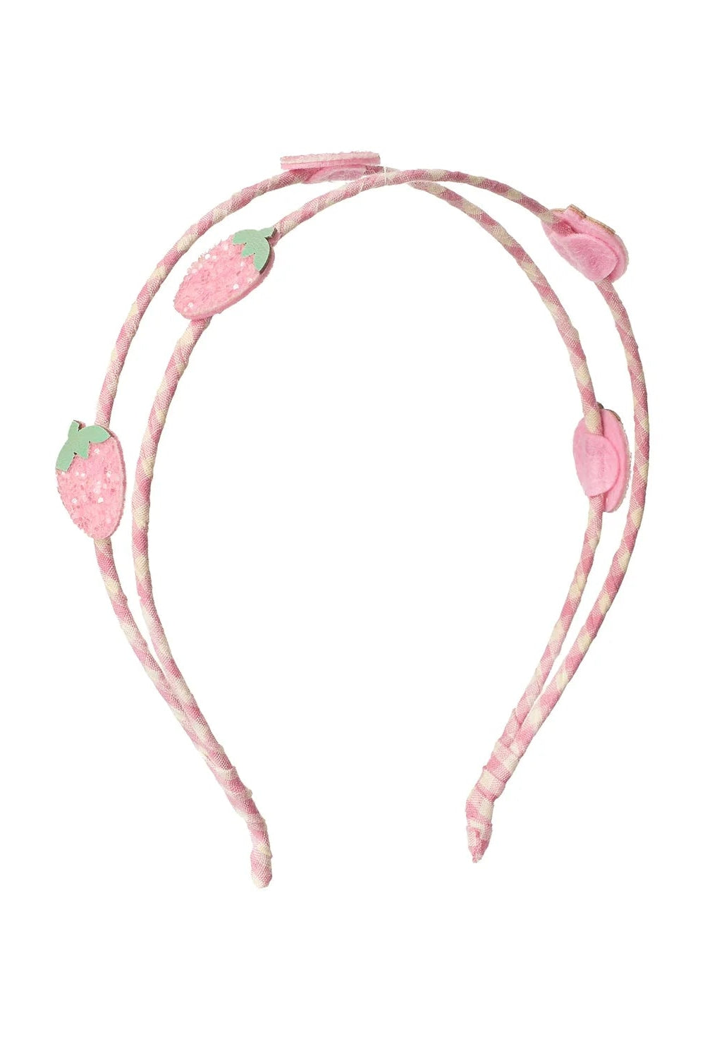 Double headband features two bands of super sweet strawberries, perfect for those summer adventures! Wrapped in a gorgeous pink gingham ribbon, this headband is designed to provide a comfortable fit for little heads.