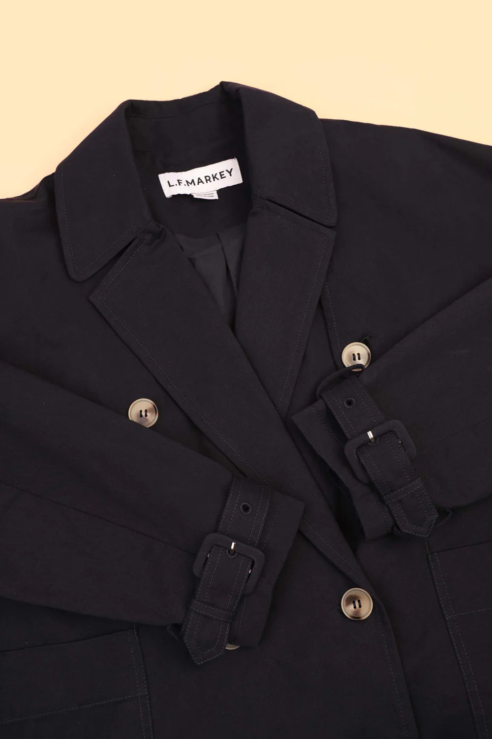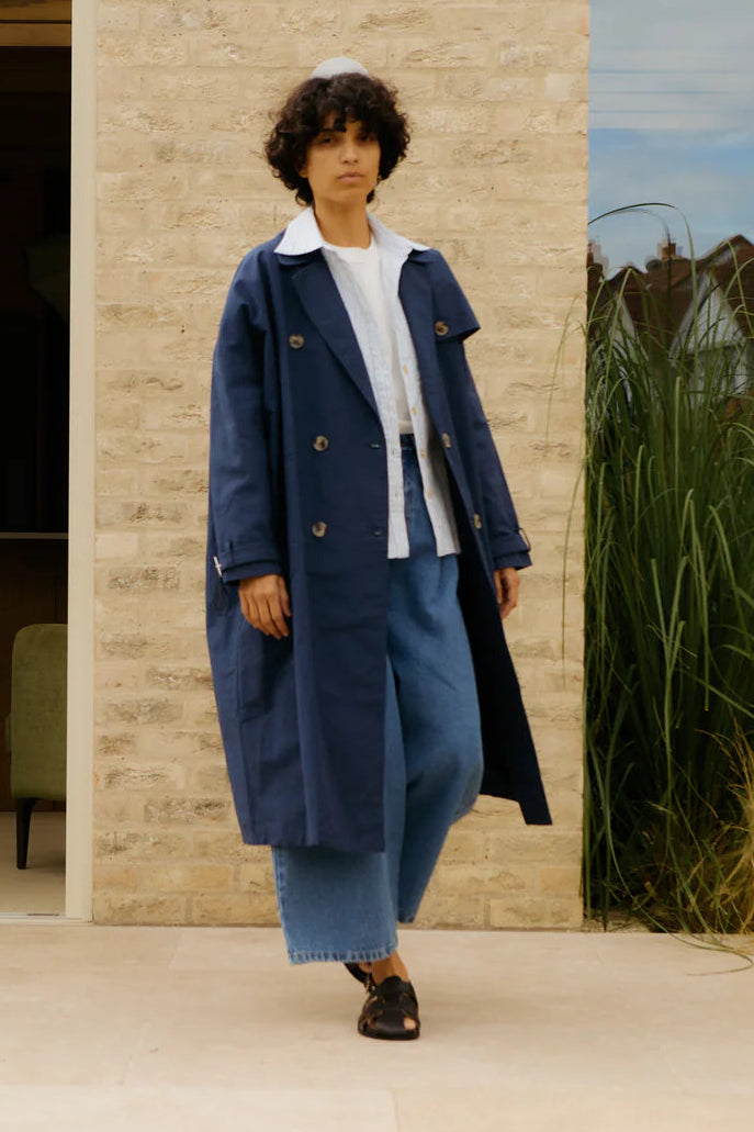 A classic trench coat with a modern twist. Features a wide boxy cut, dropped shoulders, a double-breasted front opening and a gathered back seam. Features a storm flap detailing on the front shoulder, utility style patch pockets and side welt pockets. Adjustable buckled straps on the sleeves and imitation horn buttons throughout. Made in a fine cotton drill with a crisp handfeel, and fully-lined in lightweight cotton.