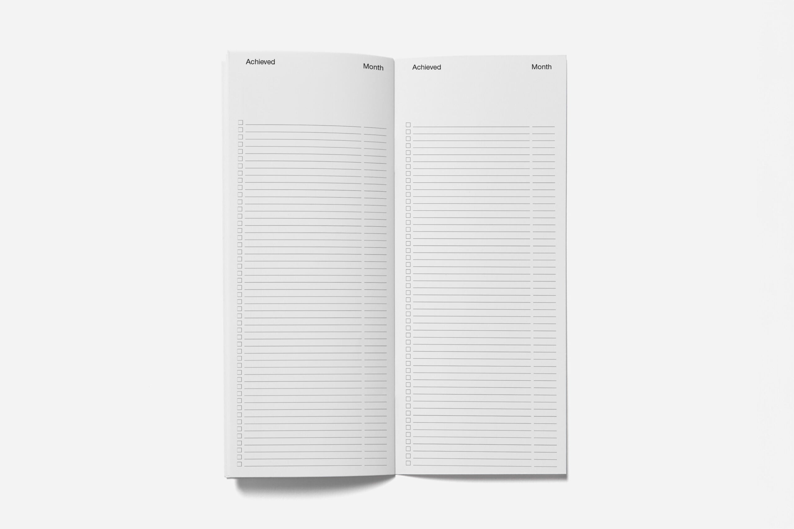 The Year Plan features 56 pages divided into five sections: Plans Lists, Month Lists, Month Plan Grids, Achieved Lists, and Notes. Designed for personal or professional planning, it adapts to your pace — whether tracking one month at a time or the full year. With its narrow format, flat staple binding, and Cradle to Cradle Certified® paper, this slim structured year planner supports sustainable, intentional use.