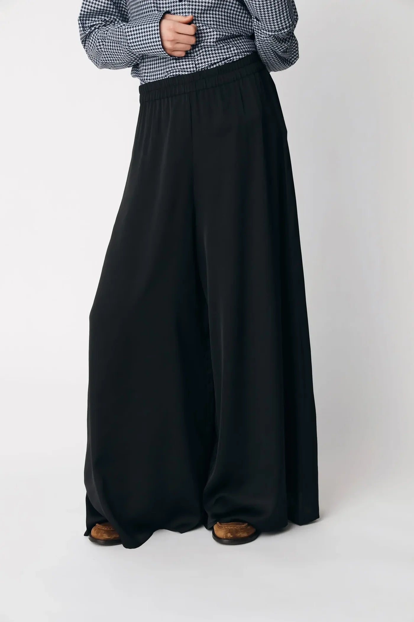 Trousers designed with a high waist and extra-wide legs. Features a low crotch and a loose fit. Finished with an elasticated waist and full-length legs.