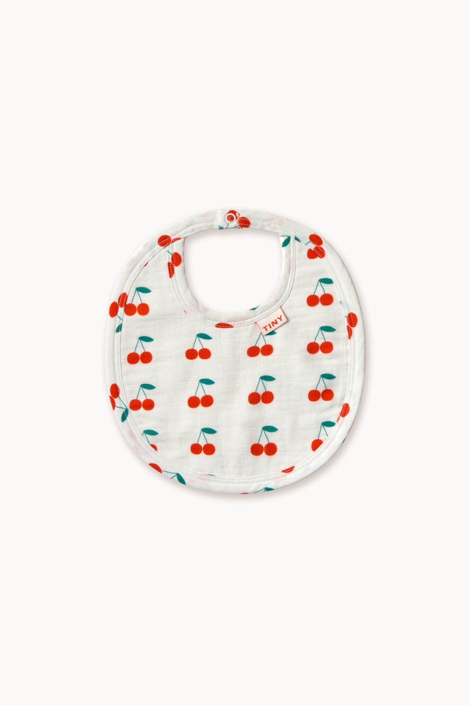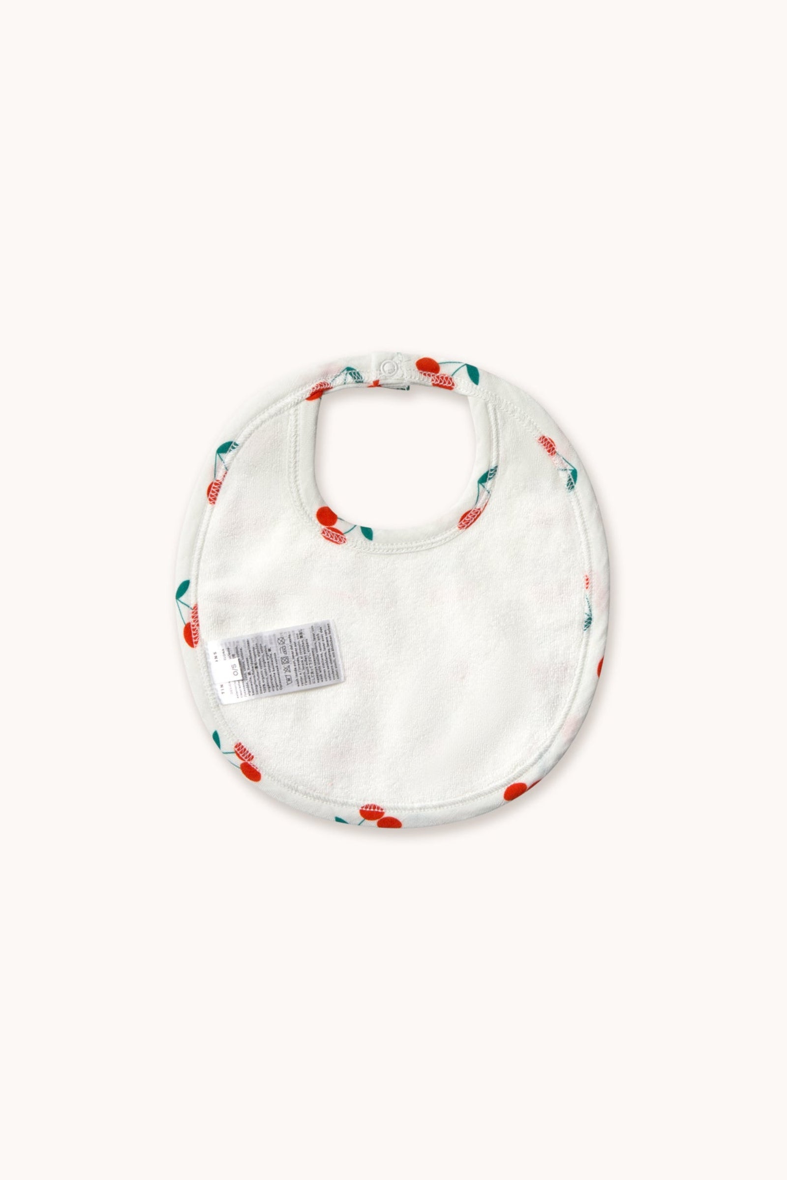 This bib is crafted from a soft organic cotton blend, gentle on delicate skin. Featuring this original Cherries allover print, it combines charm with functionality. With towel lining on the reverse and a snap button closure, it ensures easy dressing and a secure, comfortable fit—perfect for everyday use.