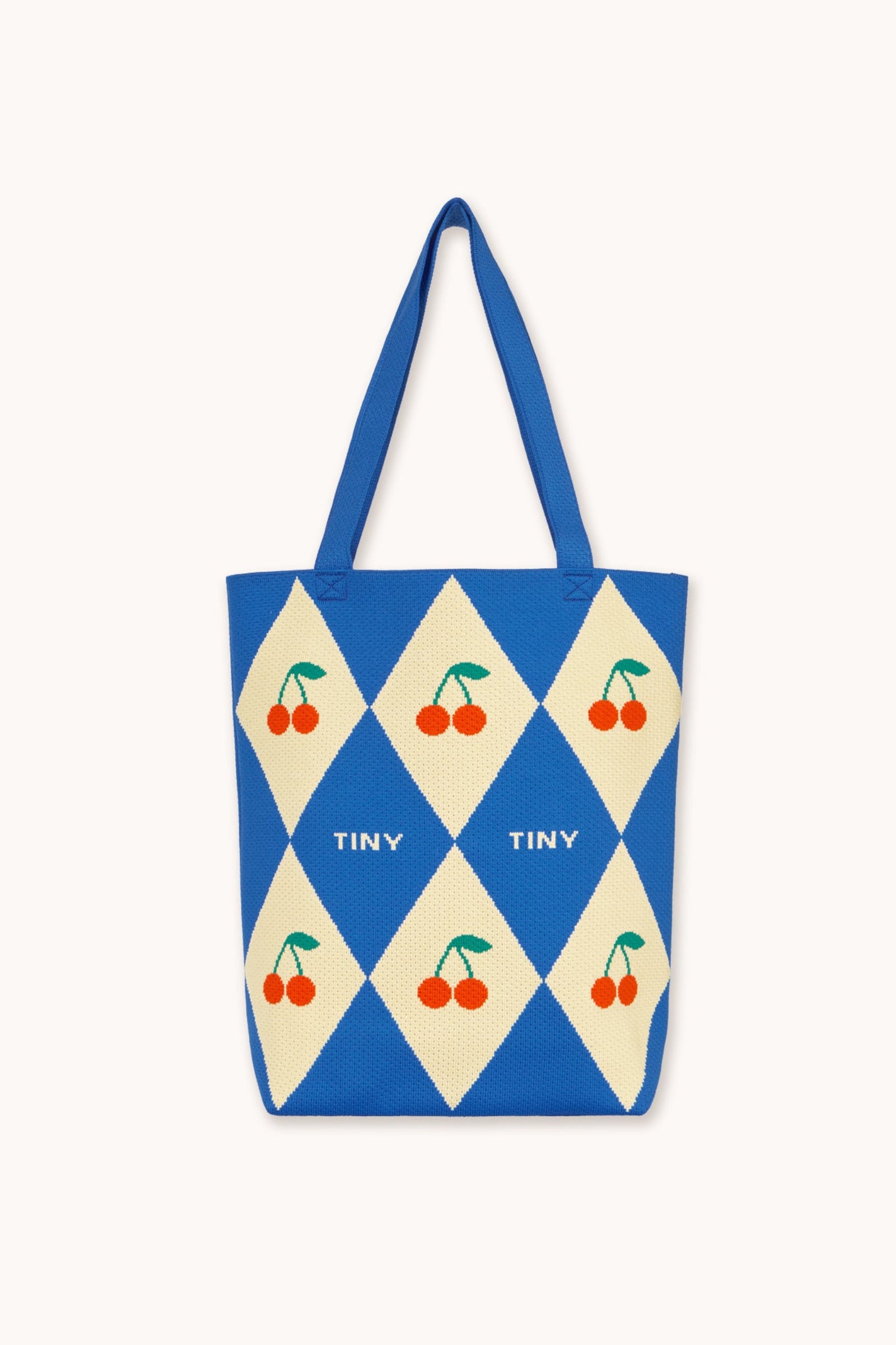 Features a charming jacquard Diamond and Cherries pattern on a blue square base. Designed with top handles and a single strap, this versatile tote can be carried by hand or worn over the shoulder. Its structured shape and spacious interior make it perfect for everyday use, whether for shopping, work, or a casual outing. A fun and functional accessory that adds a playful touch to any outfit.