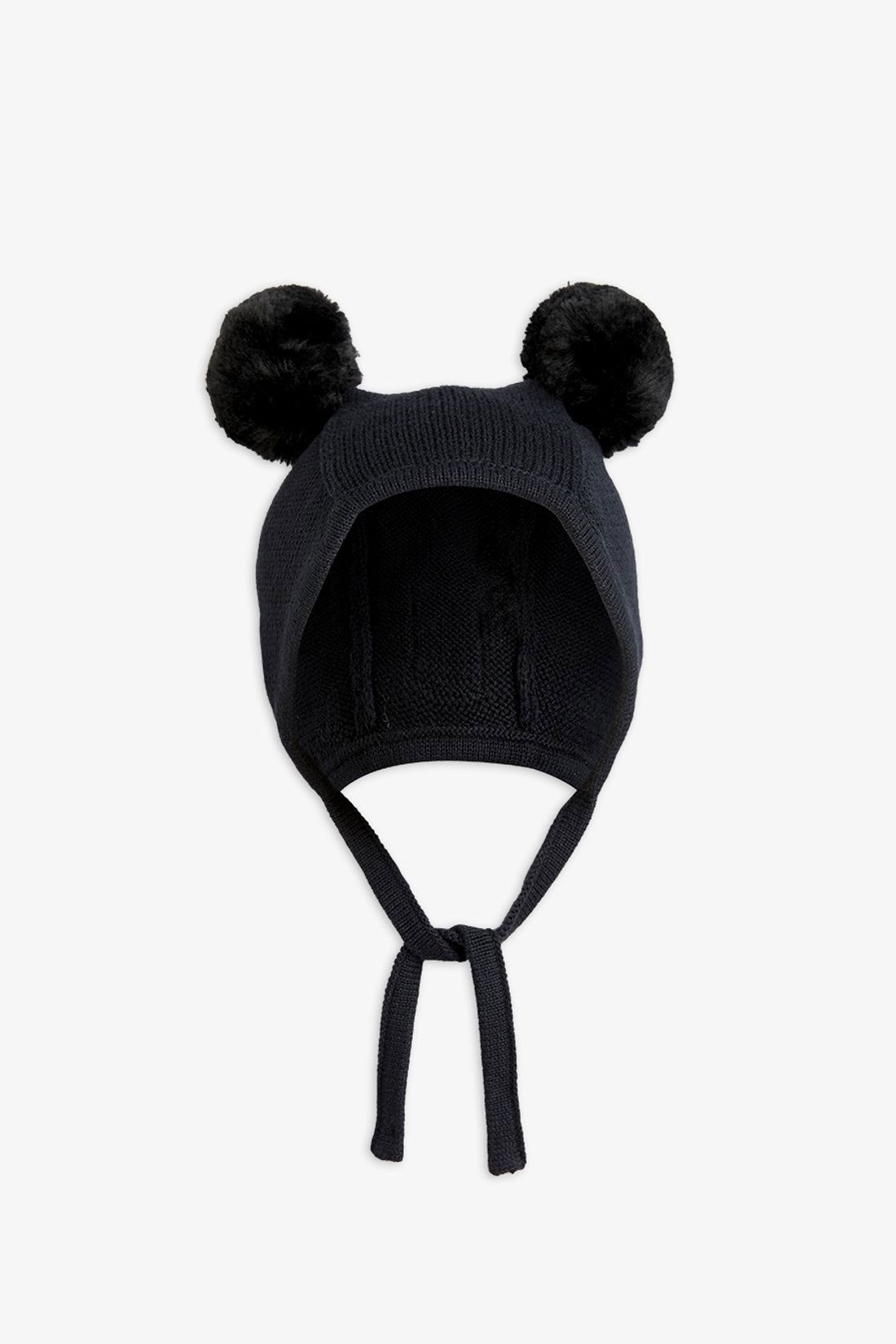 Fine-knit baby hat made from 100% GOTS certified organic cotton. Designed with two soft pom poms on top and practical tie strings to keep the hat securely in place. The rounded fit ensures comfort for little heads, and a Mini Rodini panda label is placed at the back.