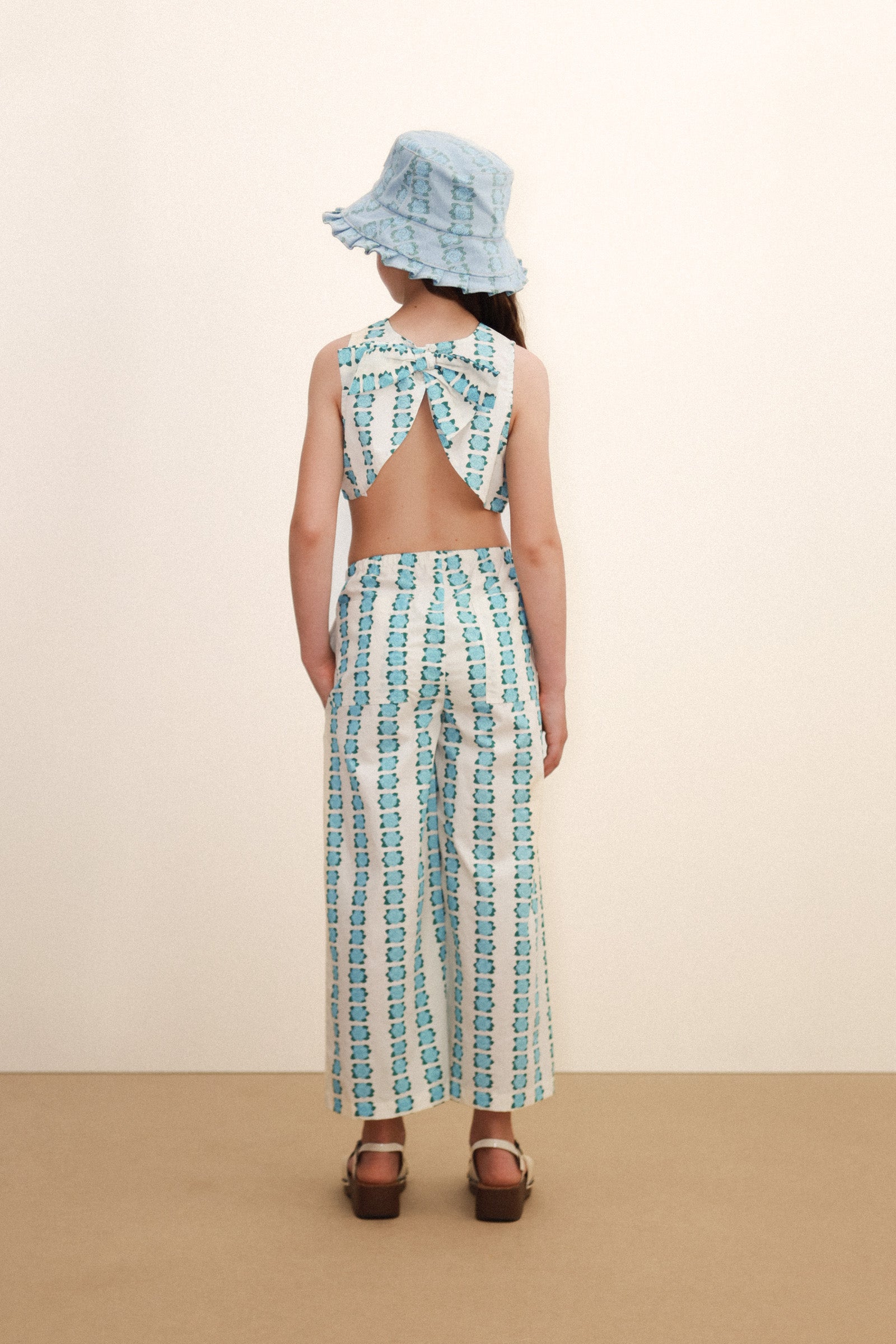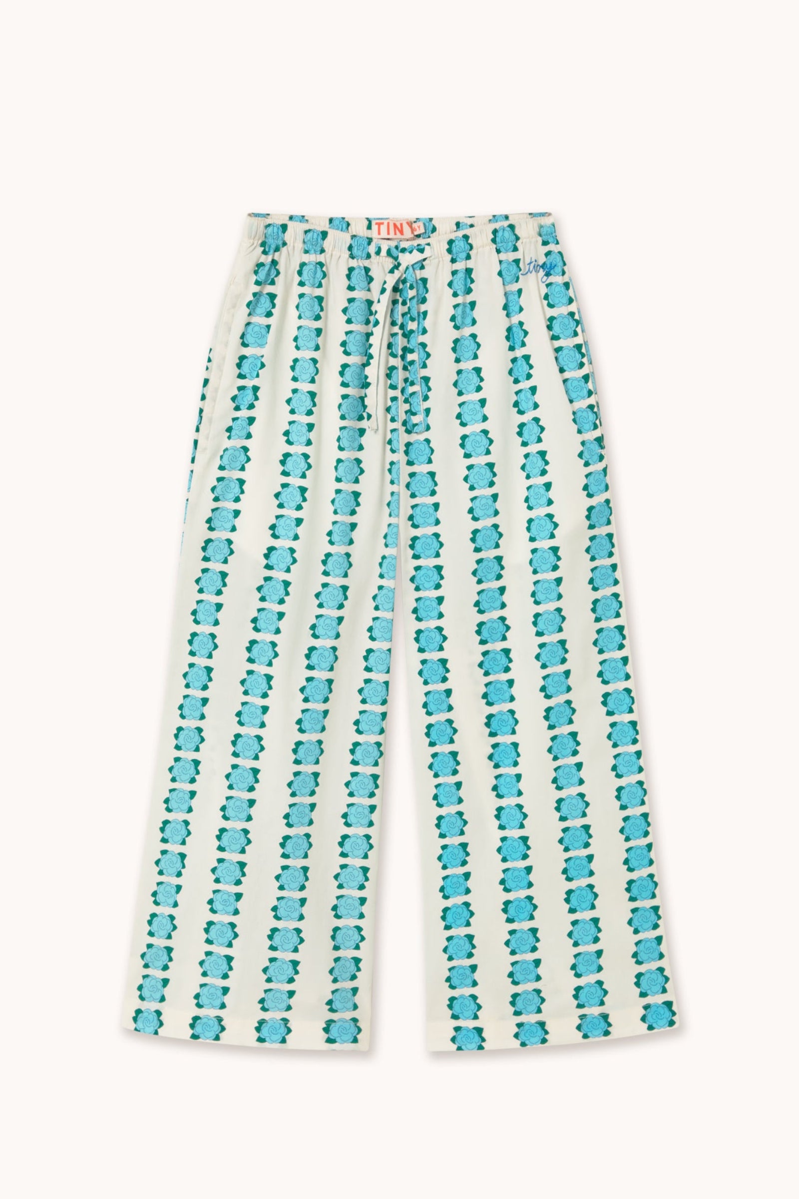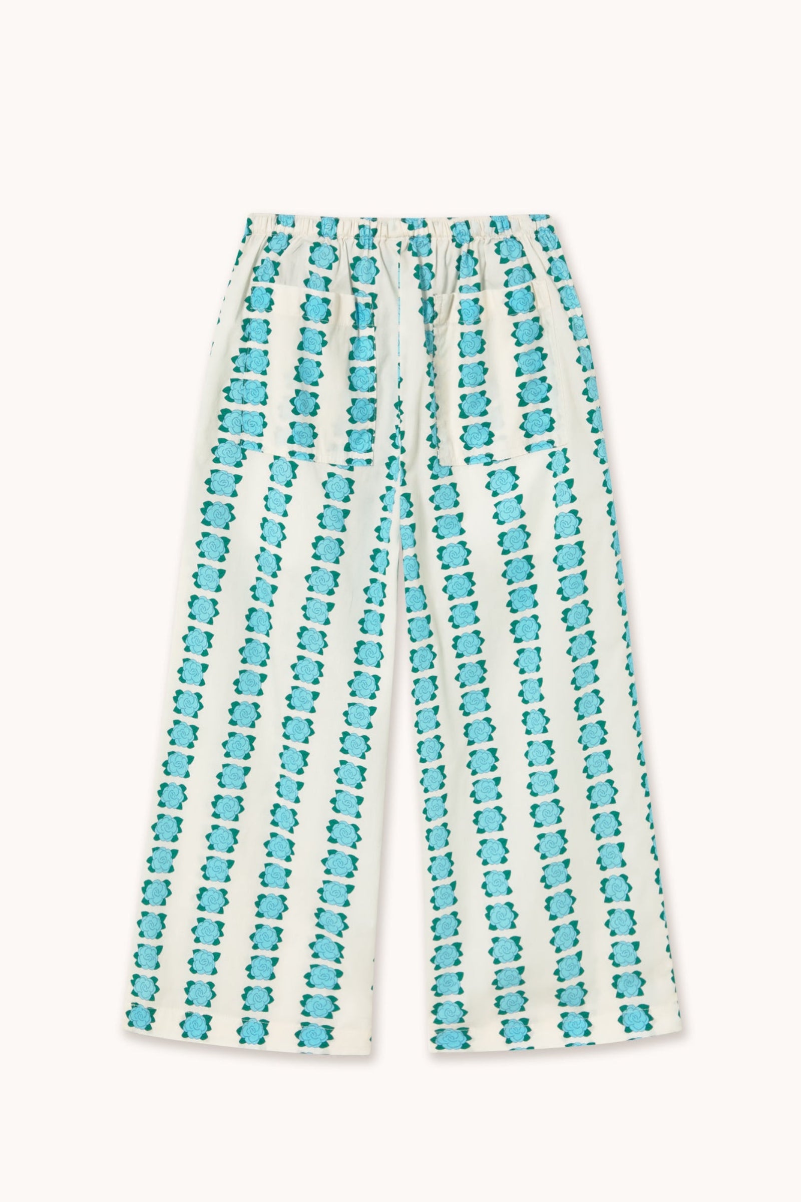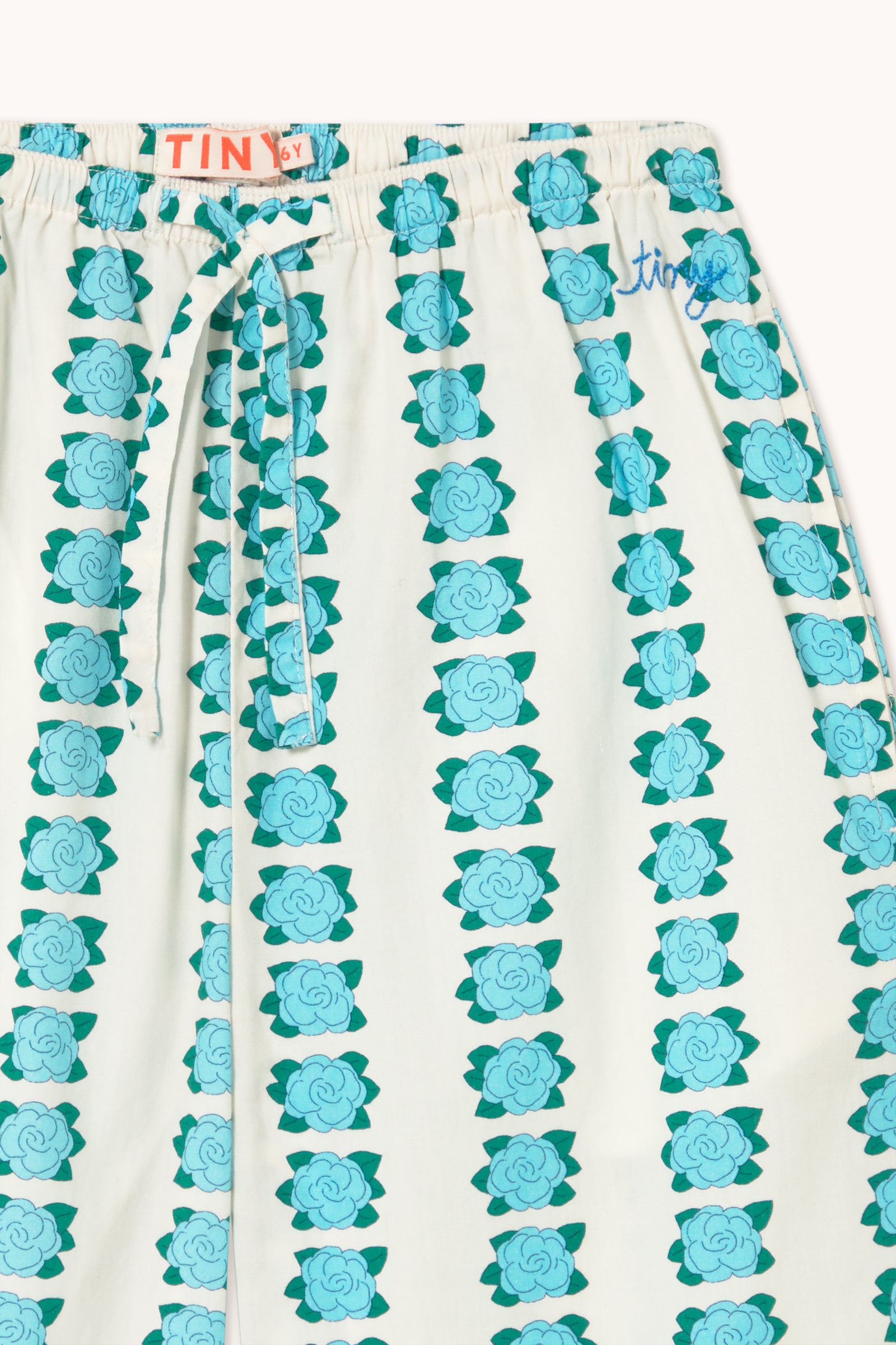 These long pants with a blue Flowers Print on an off-white base combine comfort and style in a versatile, easy-to-wear design. They feature a gathered waistband for a comfortable fit, side internal pockets, and back pockets, adding functionality with a relaxed touch. Perfect for a charming, casual look.