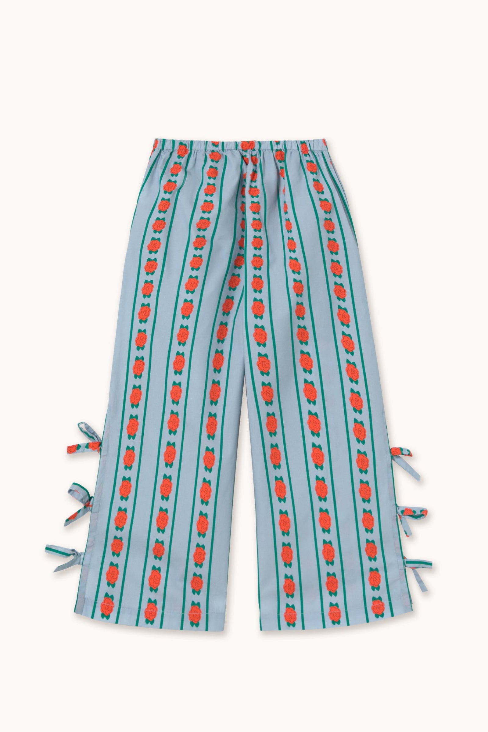 These long pants with a Rose Pattern on a washed blue base combine comfort and style in a modern, versatile design. They feature a gathered elastic waistband for a comfortable fit and wide hems with side slits and tie straps, adding a delicate, feminine touch. Perfect for a laid-back look full of personality.