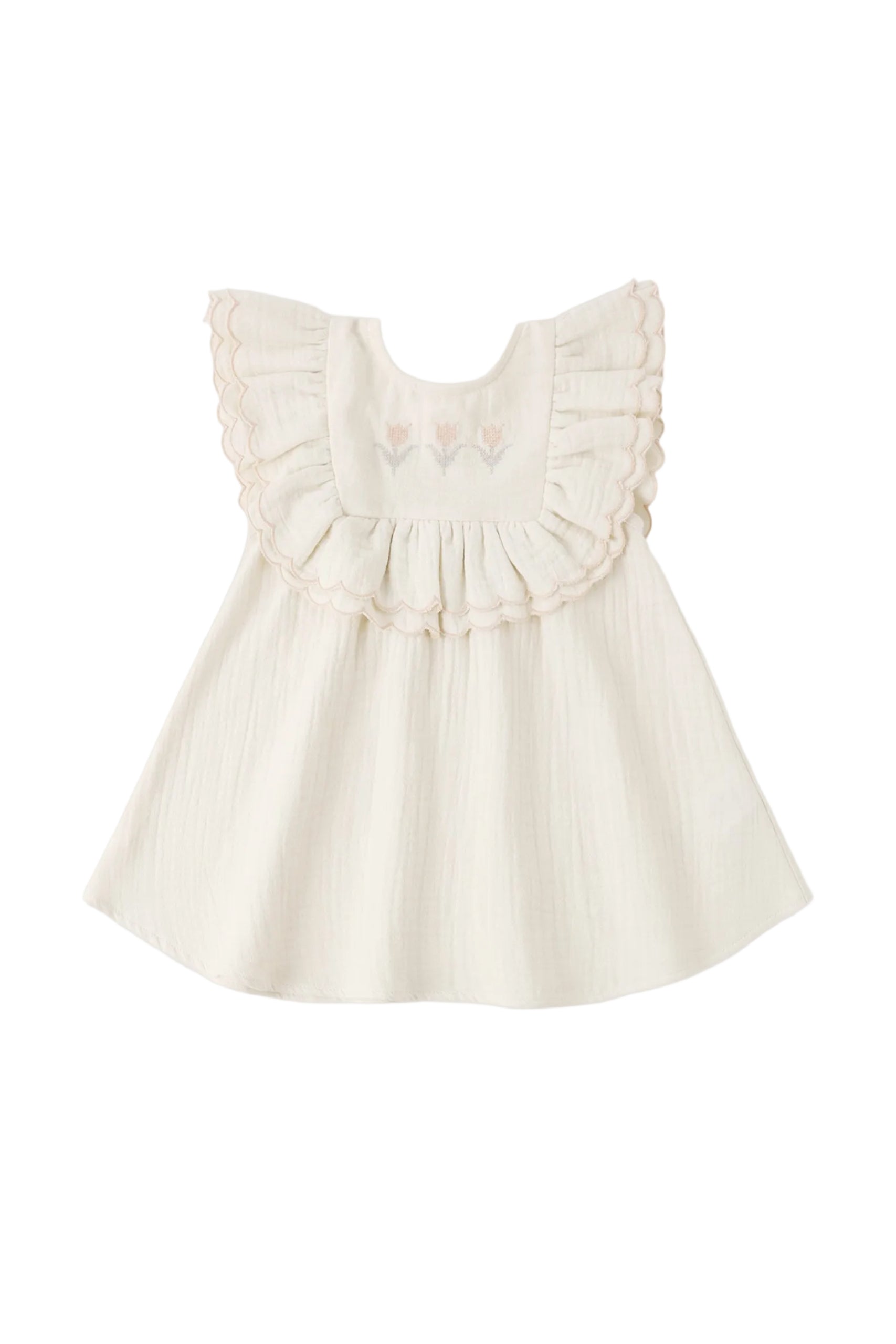 This Lulu Dress is perfect for your springtime occasions. Featuring a gathered ruffle with merrowed edge detail along the chest with tulip embroidery and buttons on back for easy changes.