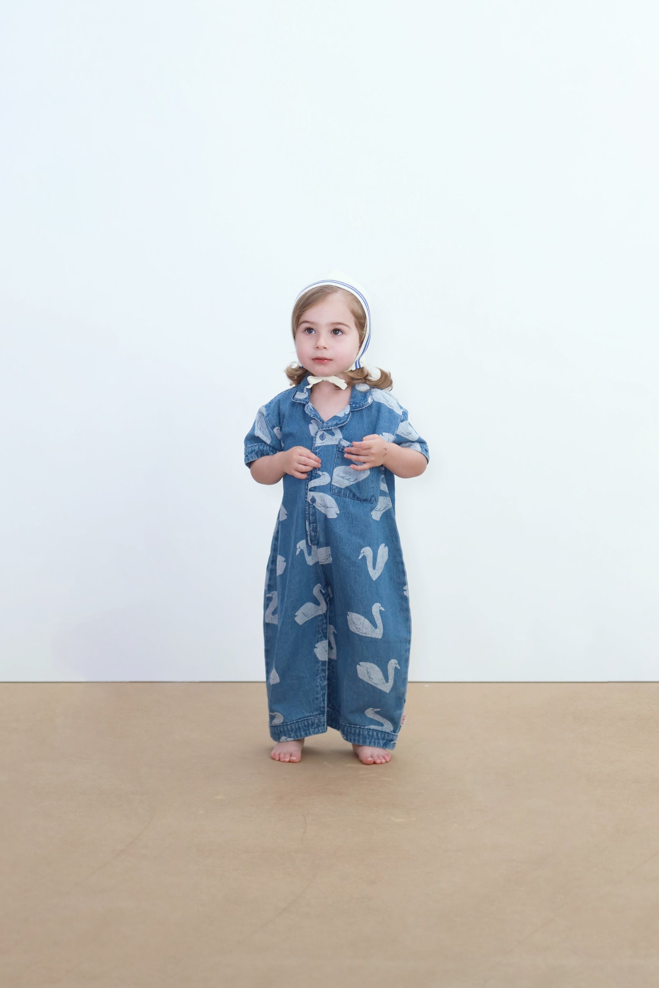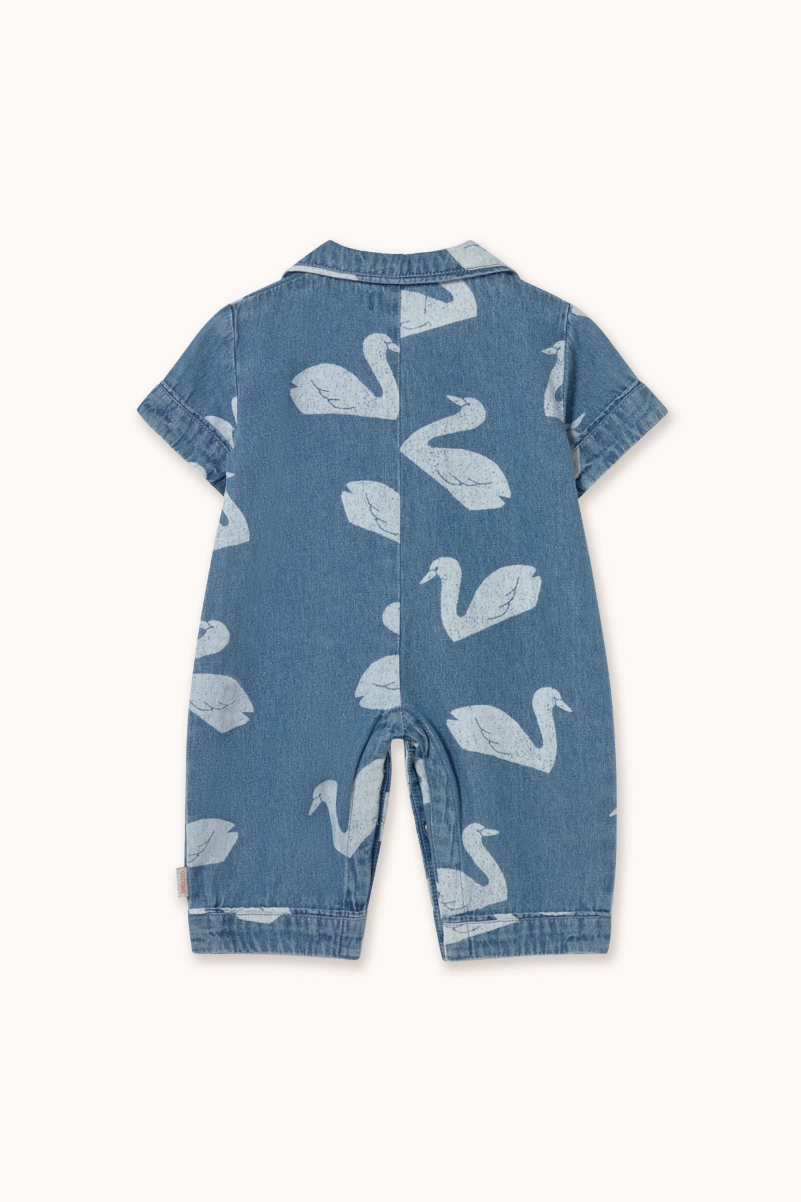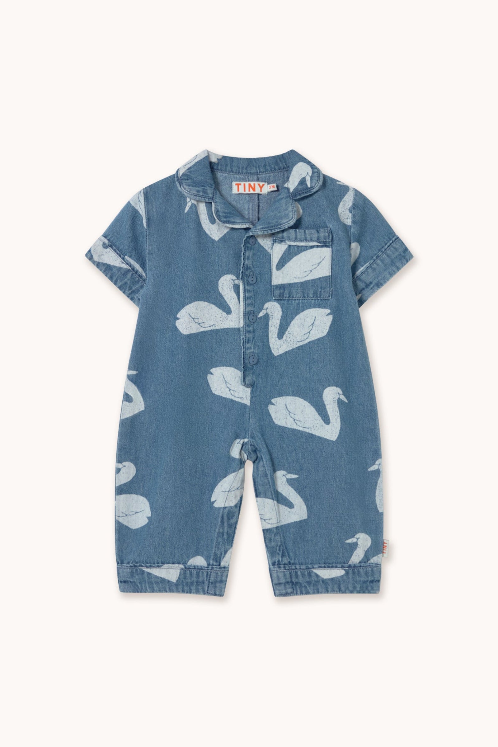This long baby one-piece in denim with a Big Swans print combines comfort and style in a practical, charming design. Featuring short sleeves, a shirt collar, a small chest pocket, front button closure, and tonal piping detail, it provides a comfortable fit with a delicate touch, perfect for any casual outfit.