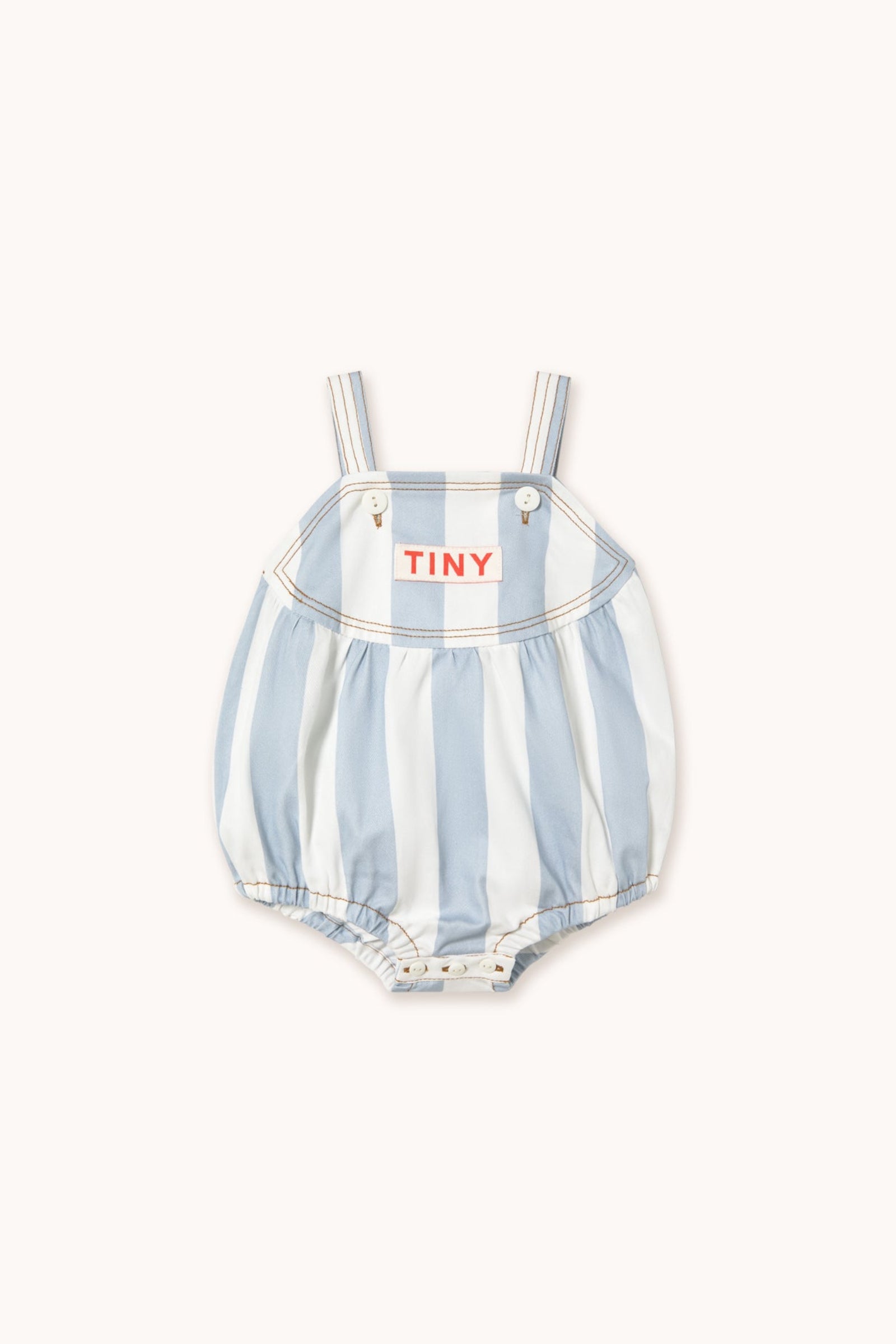 This baby bodysuit with a balloon silhouette in soft light twill fabric with an off-white base features blue stripes. With shoulder straps and a convenient snap button closure, it’s easy to put on, while the bottom snap opening makes diaper changes quick and simple. A sweet and practical design, perfect for the first days of summer.