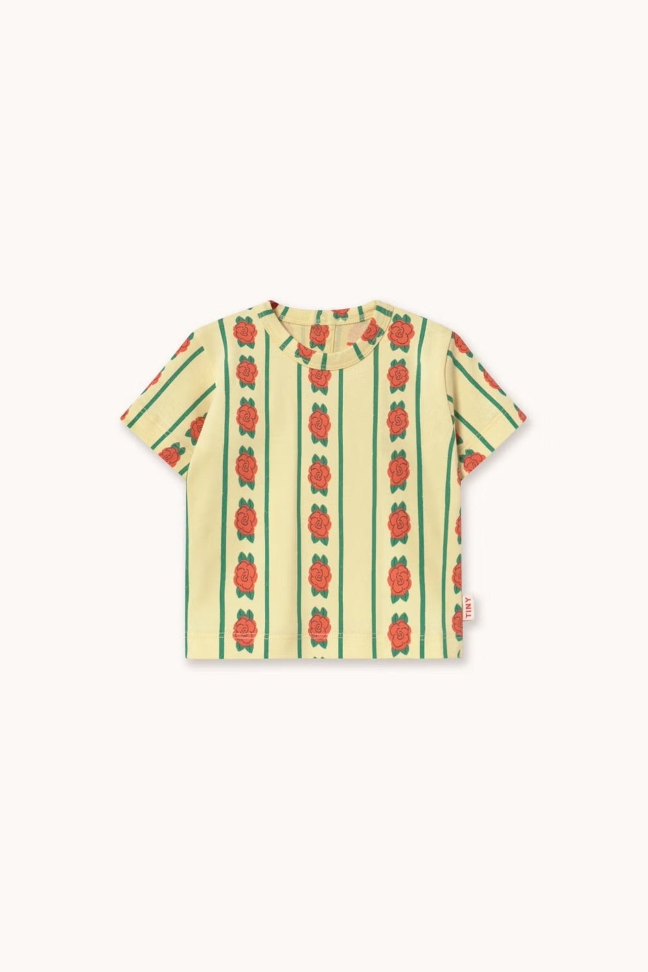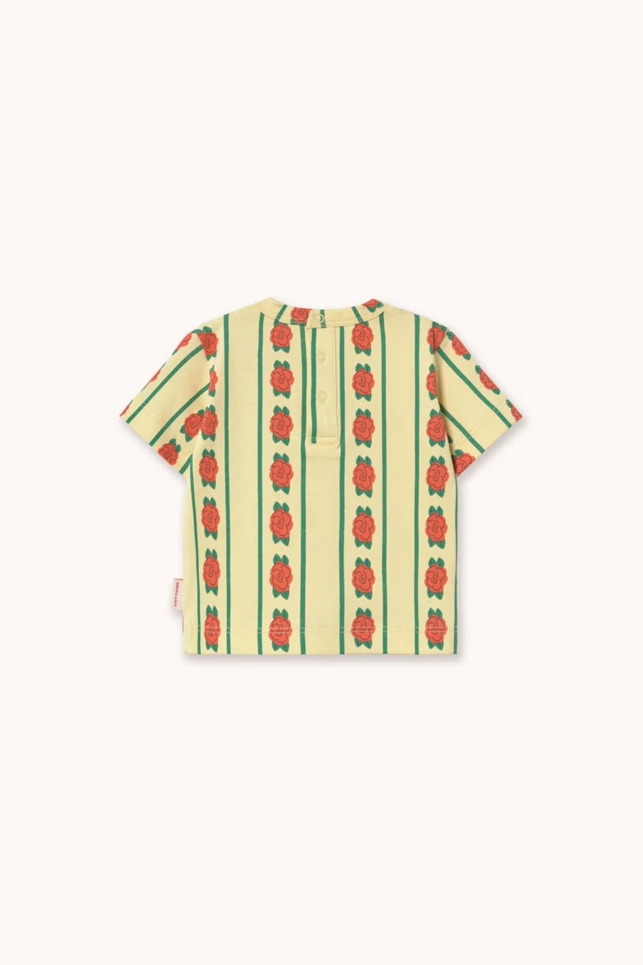 This Rose Pattern allover print tee brings cheerful charm to every day. Made from 100% organic cotton. With its relaxed fit, short sleeves, and round neckline with a snap-back opening, it offers comfort and style for every adventure.