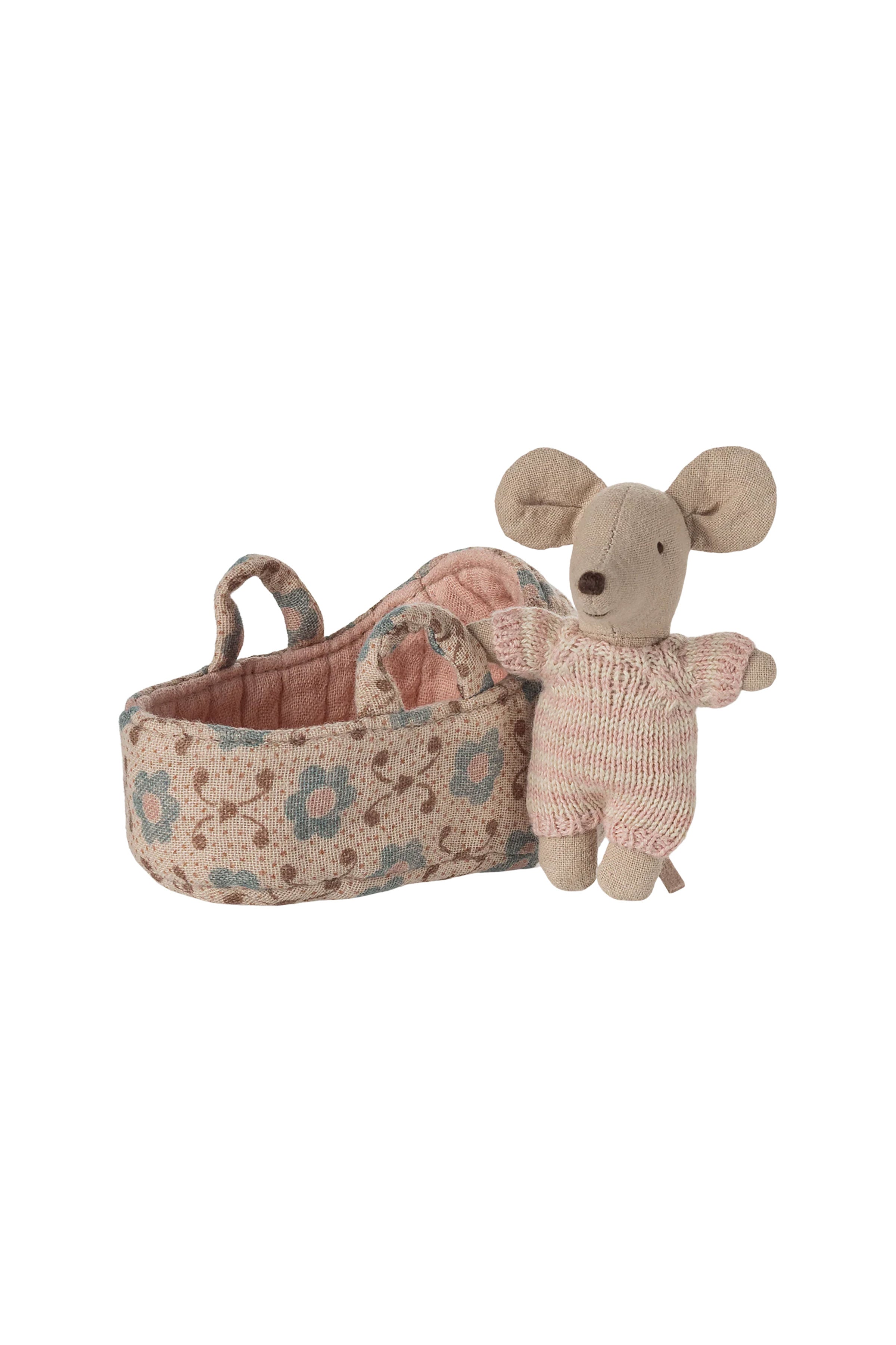 A small baby mouse in a soft and striped knitted suit. It sleeps for hours in its little quilted carry cot.