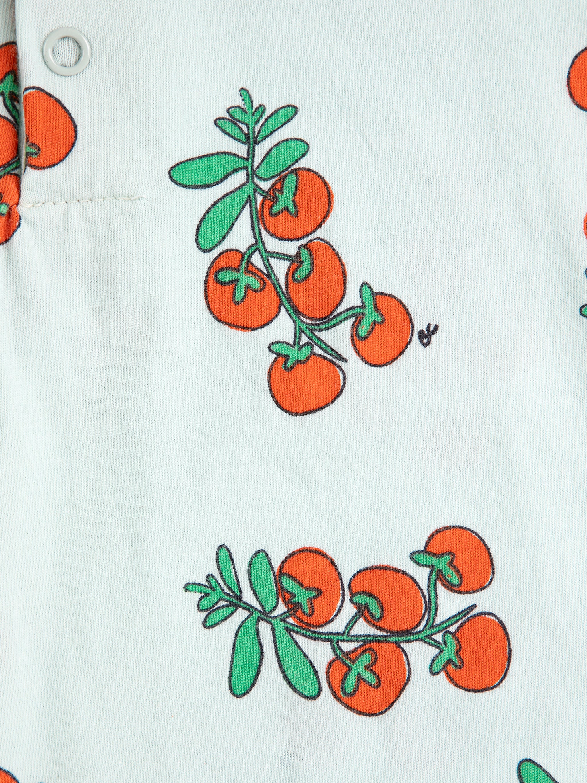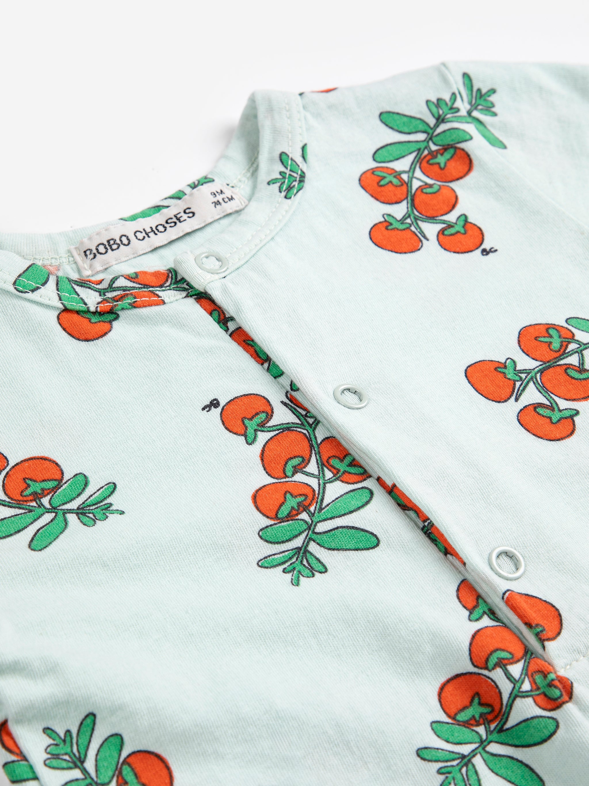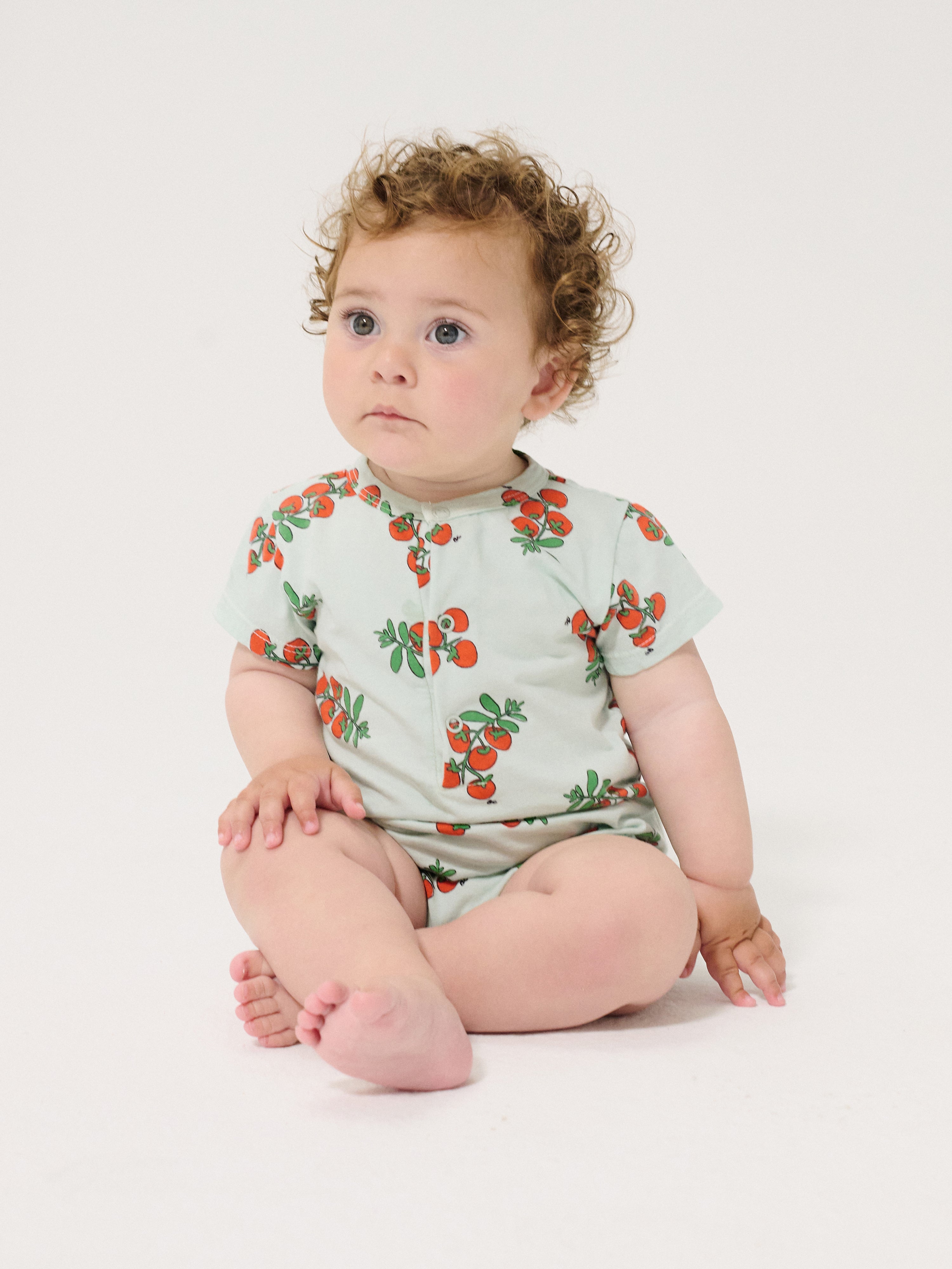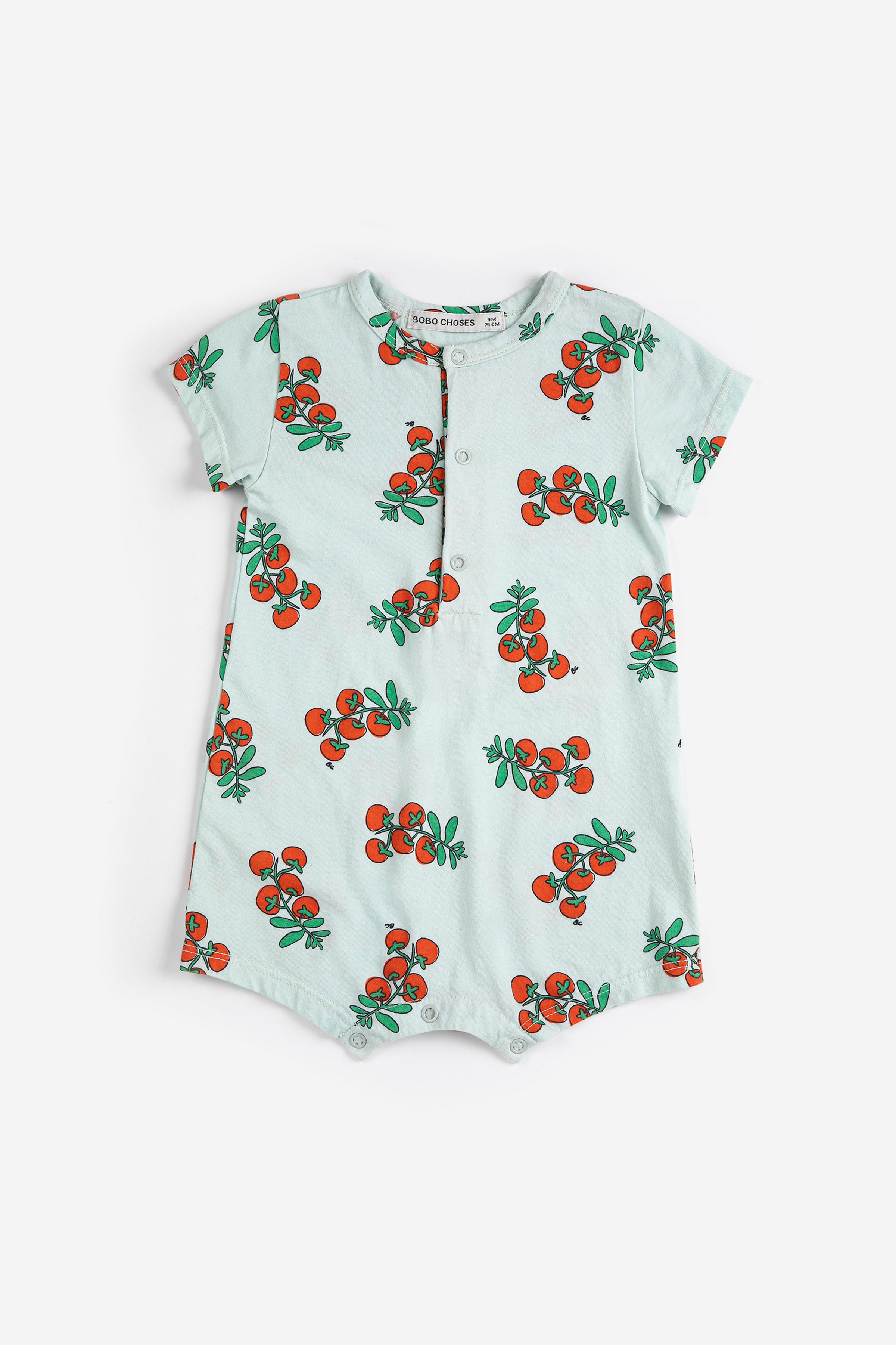 Fresh and versatile, this juicy tomato playsuit is designed with short sleeve, front button fastening, and crotch snap fastening.