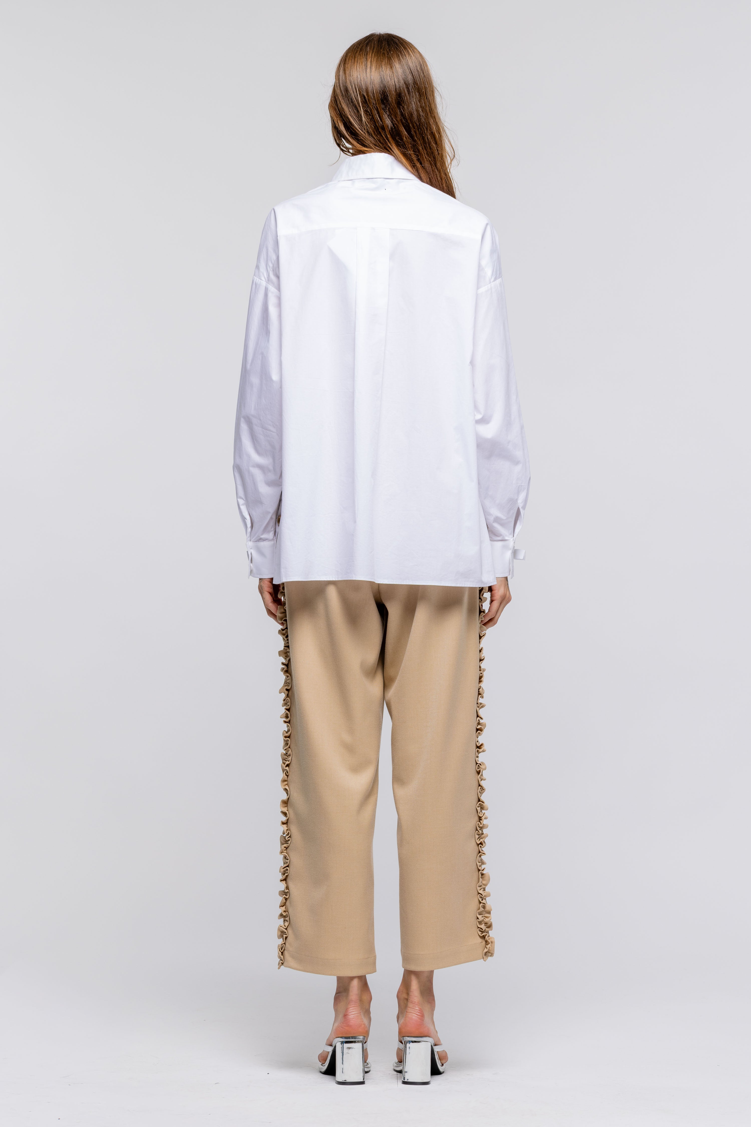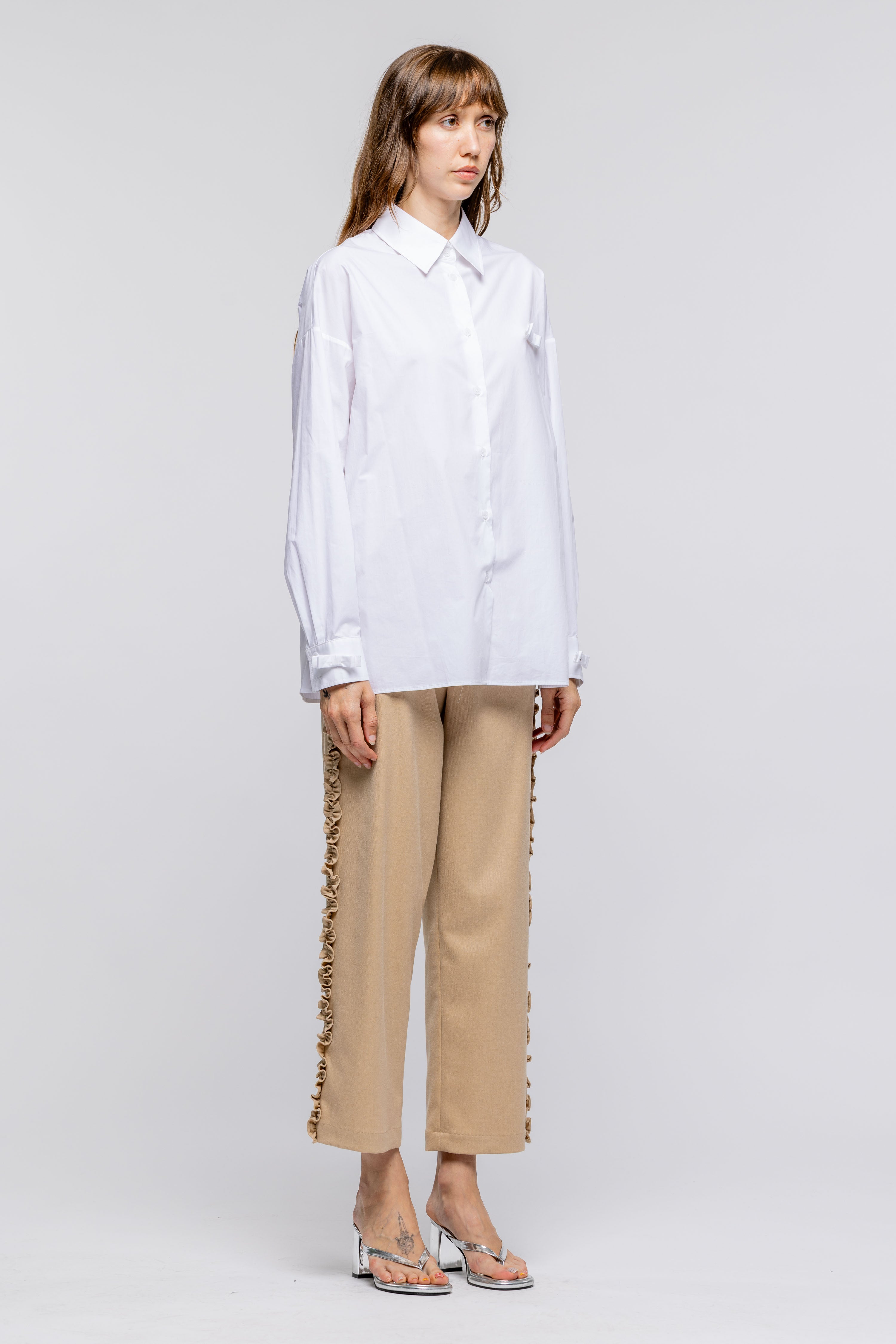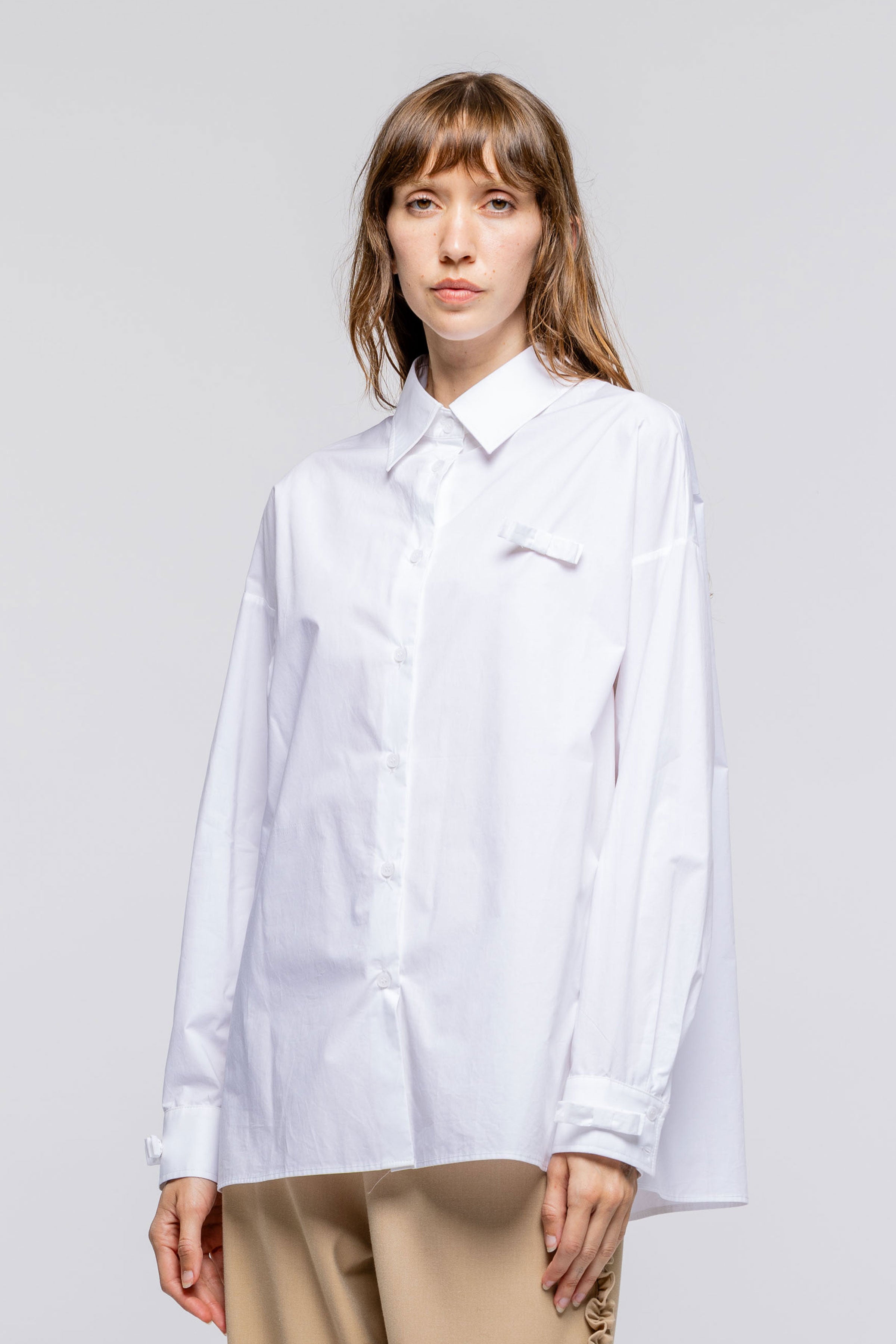 A classic shirt with decorative flat bows on chest and cuffs. She's classic with a sweet feminine touch.