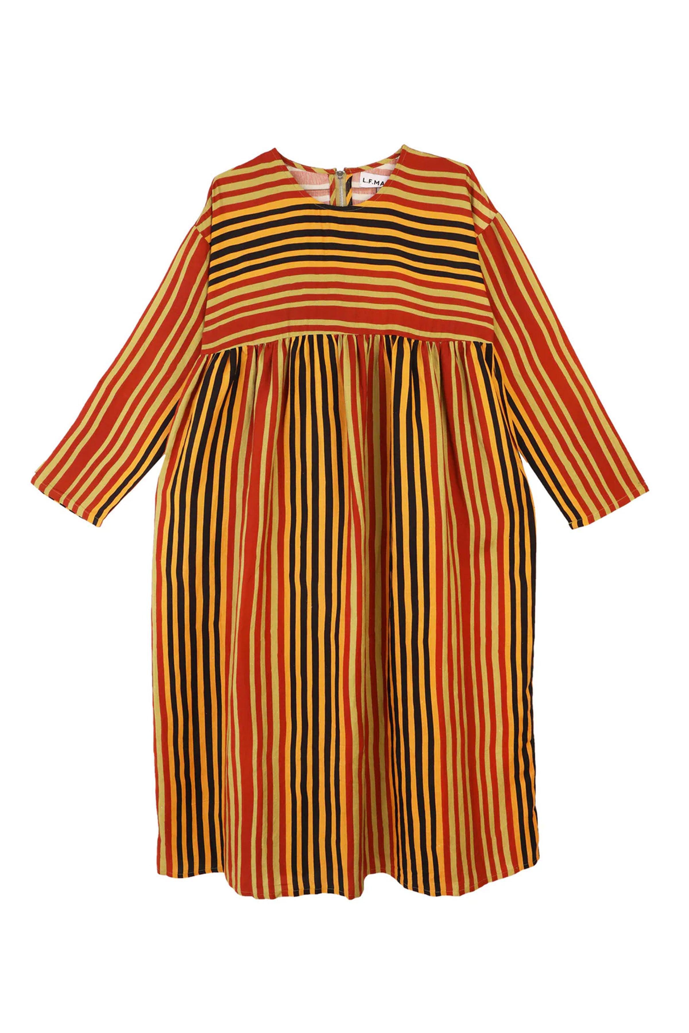 The Alder Dress is a midi length dress with a spacious relaxed fit, in a soft linen rayon blend fabric. Features an empire waistline gathered below the bust adding volume to the skirt. With longsleeves, side seam pockets, a round neckline fastened with a zip at the back. In our earthy Painter's Stripe print.