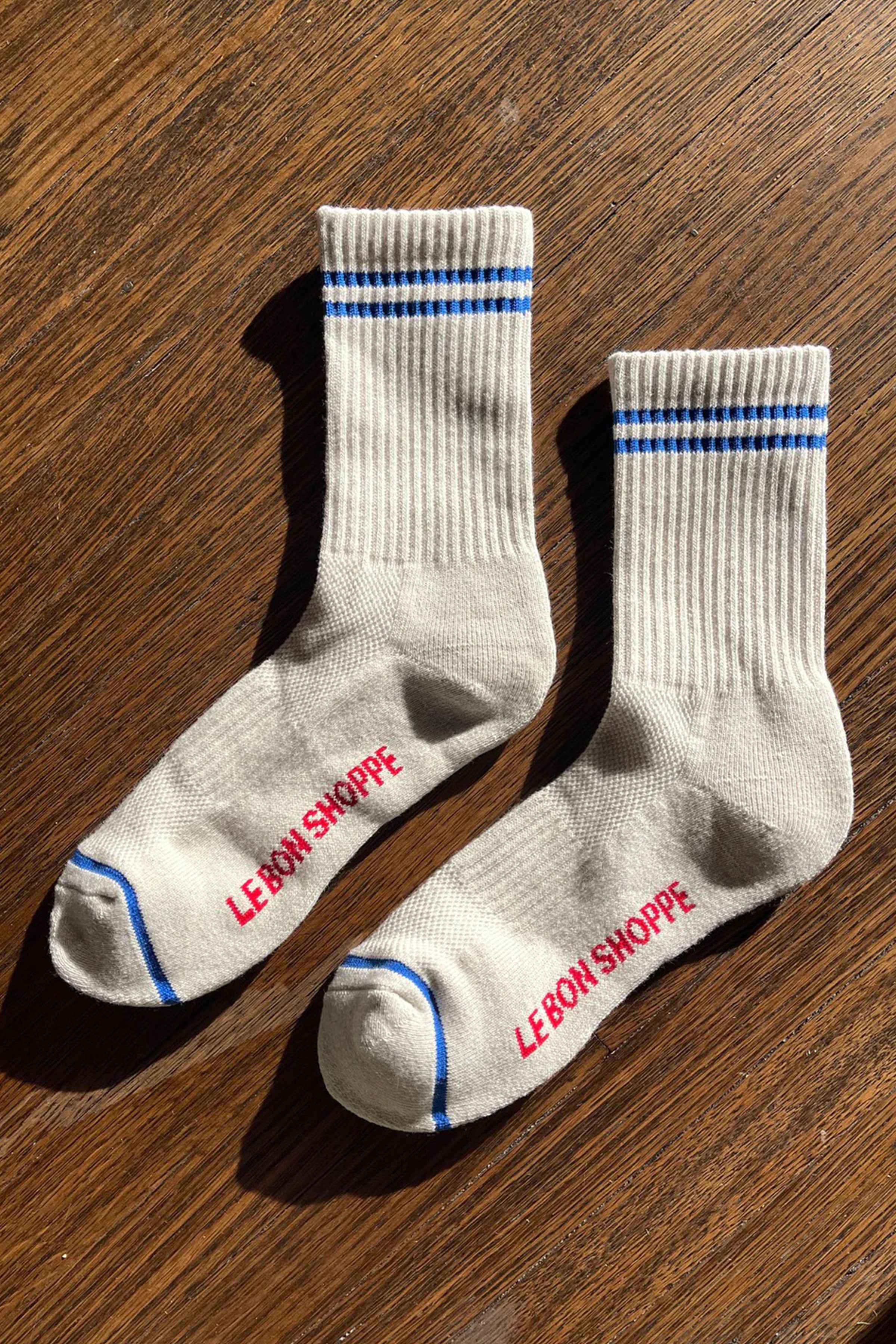 Stay fly all year long in socks that have as much range as your style. These white calf length vintage-inspired sports socks are our favorite boot, sneaker or slide socks - basically just our favorite socks, period. Oat melange with blue stripe accents, these socks will bring a dose of cool to any outfit you pair them with.
